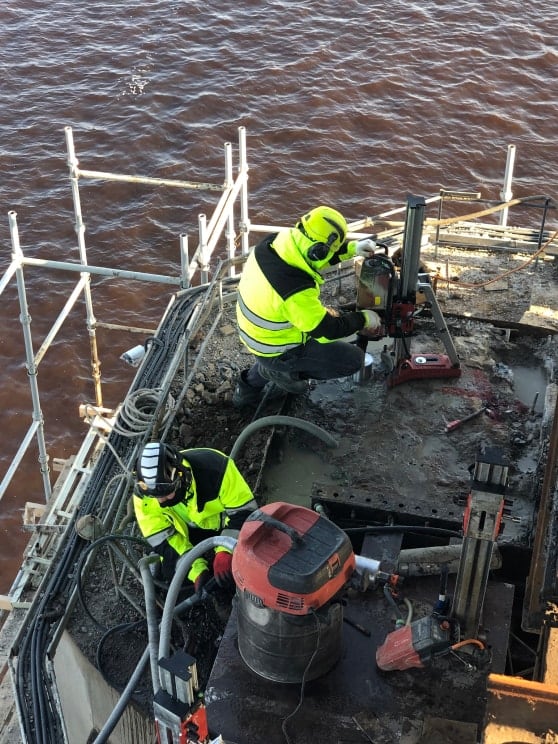 Проектное решение по замене старых мостовых опор на новые, включало в себя устройство отверстий методом алмазного бурения. Затем в отверстие на ремонтный состав EMACO вклеивался новый анкер.