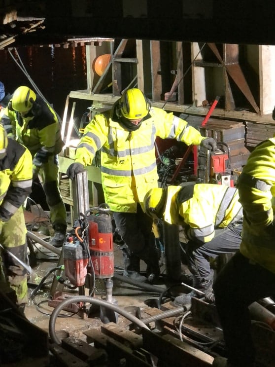В условиях где на площади 4м² параллельно работает 6 установок алмазного сверления, выбиваются керны, убирается пылесосом шлам, параллельно идет монтаж металлоконструкций и вклейка анкеров, а на работу отведено всего 2 часа и те в ночное время, принцип «минимум персонала – максимум технологий» играет ключевую роль в успехе проекта. На объекте должны быть только специалисты!